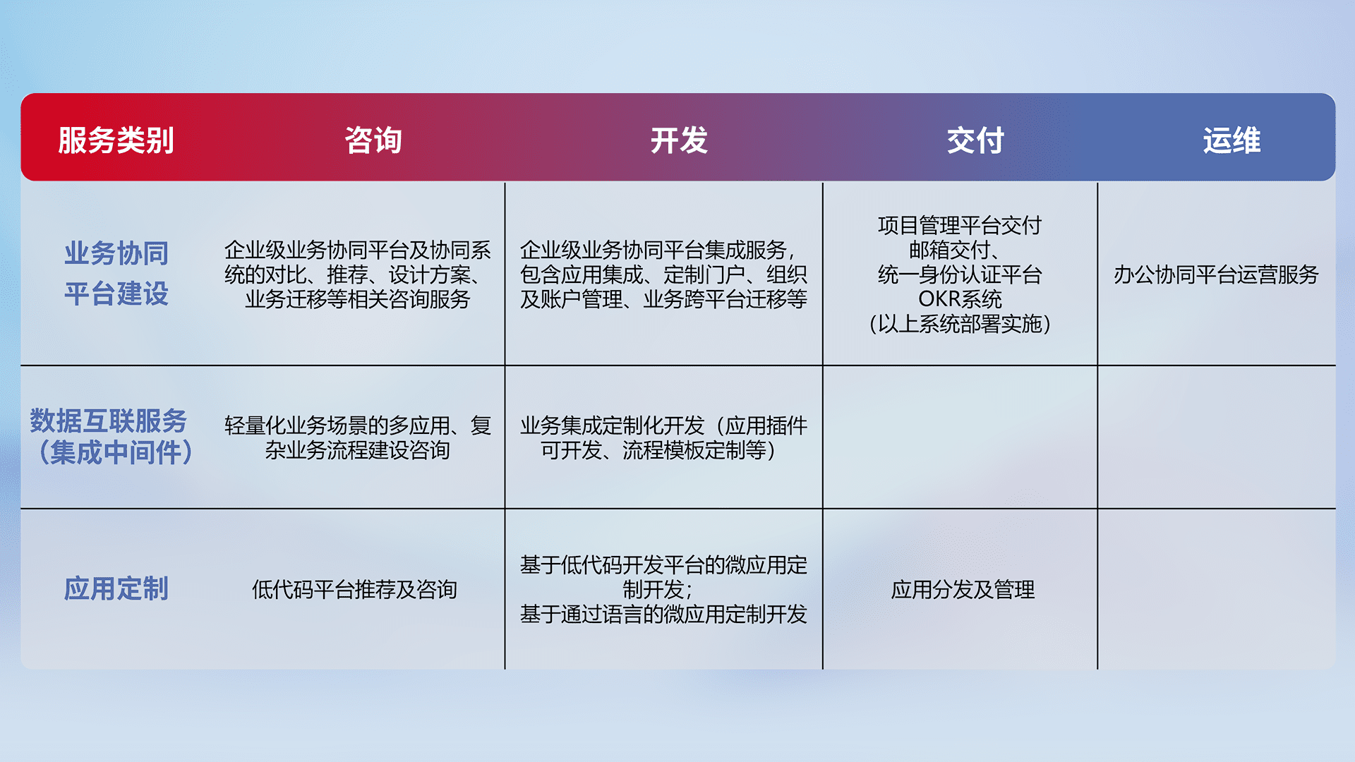 针对钉钉、、、、企微、、、IDaas等平台级产品提供产品的规划、、方案、、、交付、、、定制化开发等服务,,,实现如统一协同办公、、智能客户服务、、混合会议管理、、智能数据查询、、、等业务场景,,实现数字化转型。。。。